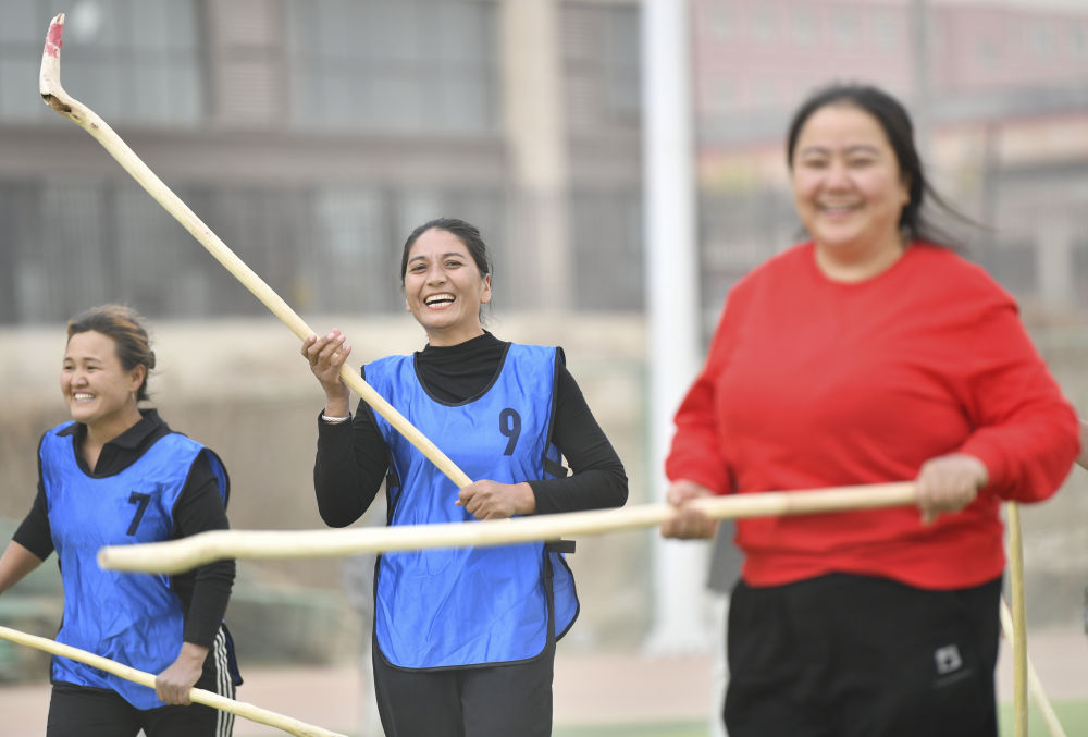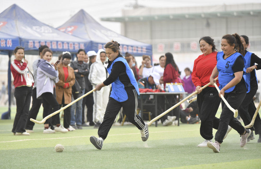 39歲的阿依古麗·買托合提是球隊里最年長的隊員。她身穿皮衣、腳踏休閑鞋,奔跑在正午驕陽下,屢屢揮動球桿,拼搶也毫不遜色。一起訓(xùn)練的隊友有人穿著牛仔褲,有人穿著襯衫,還有人穿著后跟略高的鞋子。紅色的球洞穿由兩個塑料水瓶組成的球門,得分的一方歡呼不已,失球的隊員則懊惱地擦去臉上的沙塵。