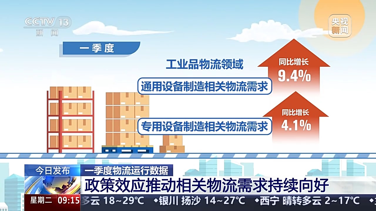 政策效應(yīng)持續(xù)顯現(xiàn),大規(guī)模設(shè)備更新、消費(fèi)品以舊換新政策推動(dòng)相關(guān)物流需求持續(xù)向好。一季度,工業(yè)品物流領(lǐng)域的通用設(shè)備、專用設(shè)備制造相關(guān)物流需求,同比分別增長9.4%、4.1%;民生消費(fèi)領(lǐng)域的通信器材類、家用電器和音像器材類、家具類商品零售相關(guān)物流需求同比分別增長26.9%、19.3%和18.1%。