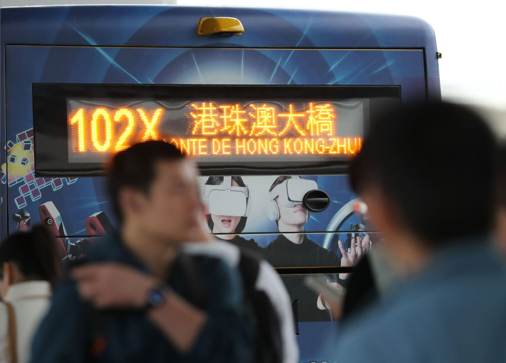 市民和旅客在橫琴口岸澳門口岸區(qū)排隊,準(zhǔn)備登上前往港珠澳大橋方向的公交車。新華社記者 王益亮 攝