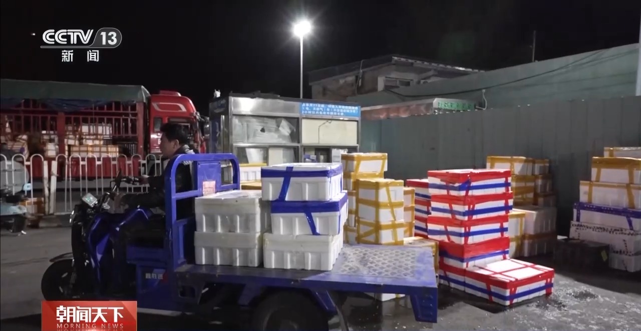 總臺央視記者 張琪:在北京大紅門京深海鮮批發(fā)市場,凌晨2點半,進場的車輛絡(luò)繹不絕,物流停車場也停滿了正在卸貨的貨車。