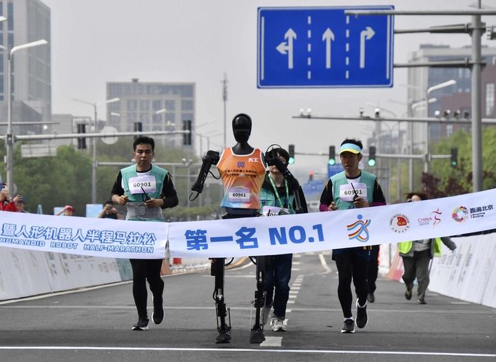 2025年4月19日,在北京亦莊舉行的2025北京亦莊半程馬拉松暨人形機(jī)器人半程馬拉松比賽上,天工隊選手天工Ultra(左二)沖向終點(diǎn)。