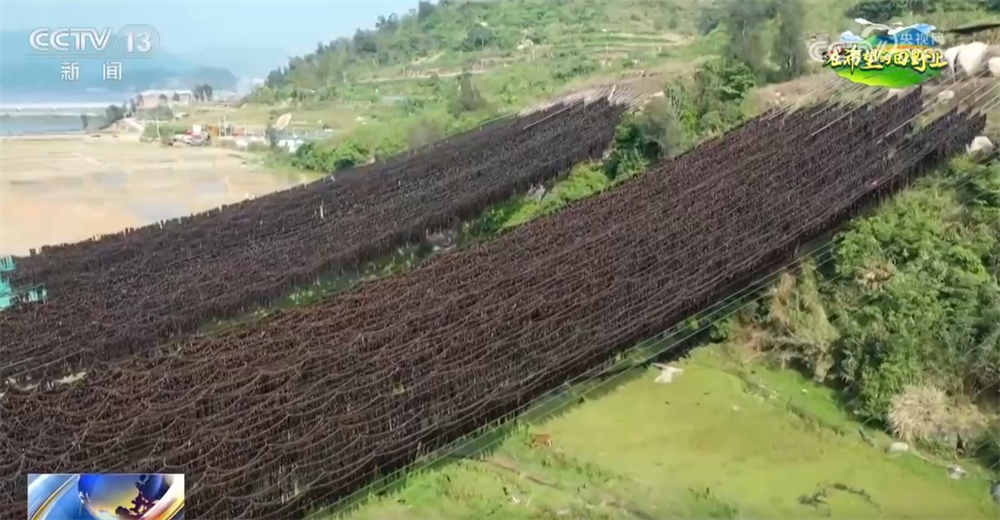 從空中俯瞰,成排鋼索從半山腰鋪架下來,層層疊疊的海帶如綠色瀑布傾瀉。與傳統(tǒng)地面晾曬相比,這種立體掛曬的方式通風性更好,能縮短晾曬周期,還能減少泥沙附著,保持海帶潔凈干爽,提升海帶品相。