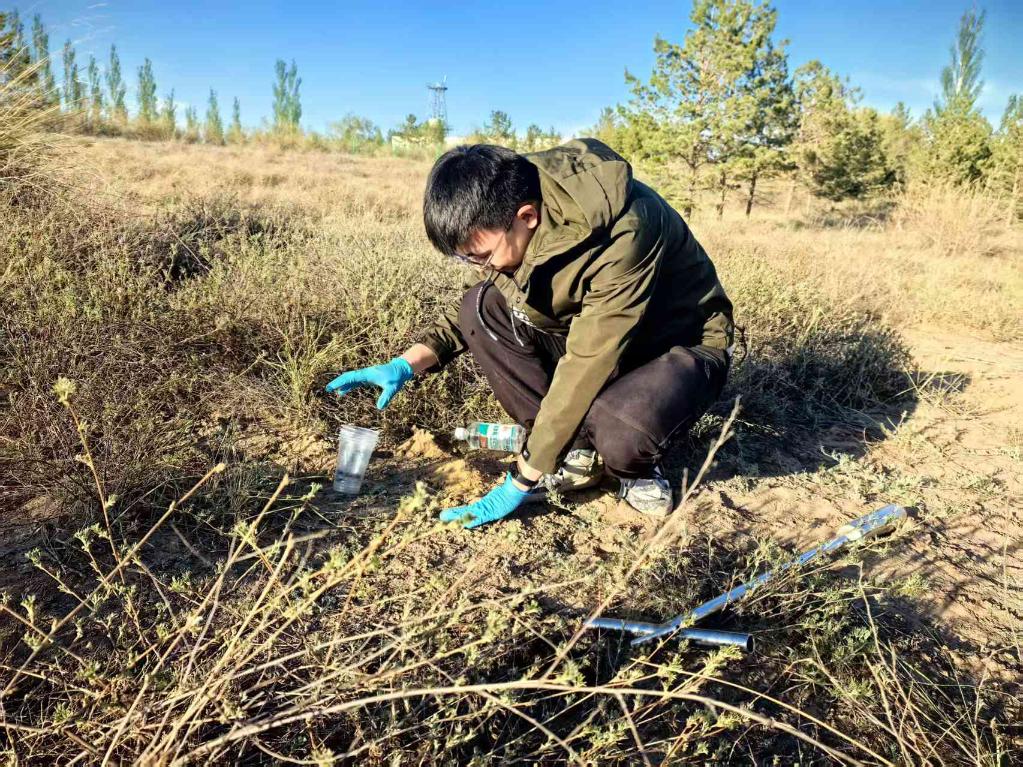 北京林業(yè)大學(xué)博士生農(nóng)皓鈞在野外做荒漠土壤動(dòng)物研究。新華社記者 馬麗娟 攝