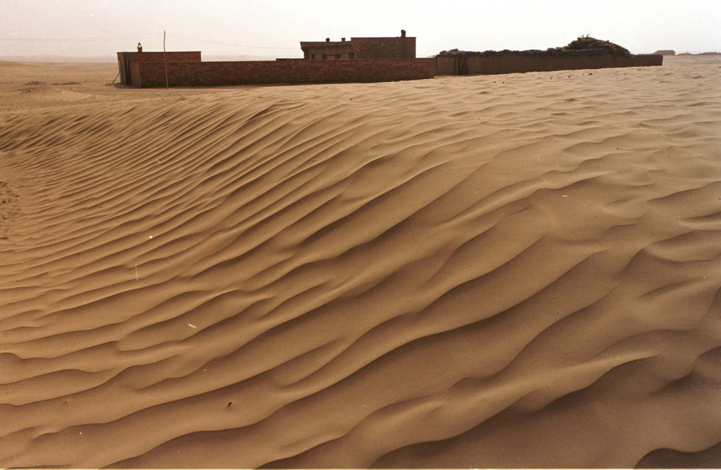 2002年拍攝的資料照片,寧夏鹽池縣馮記溝鄉(xiāng)黎明村土地沙化,村民院落被流動(dòng)沙丘包圍。新華社記者 劉泉龍 攝