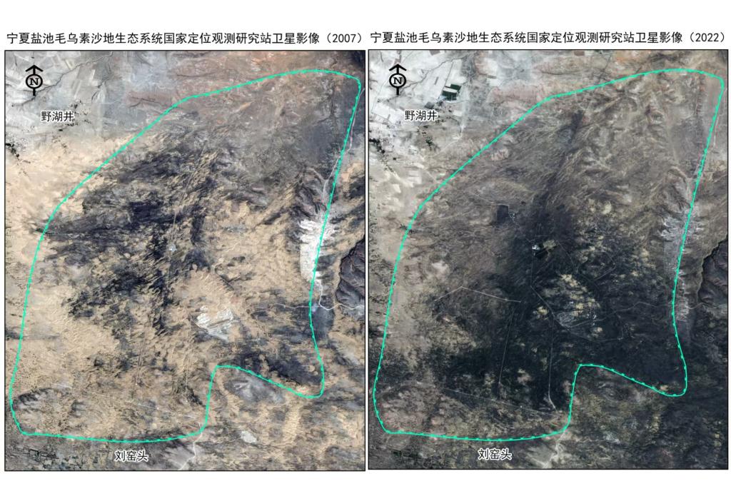 寧夏鹽池毛烏素沙地生態(tài)系統(tǒng)國(guó)家定位觀測(cè)研究站2007年和2022年衛(wèi)星影像對(duì)比圖。(受訪者供圖)