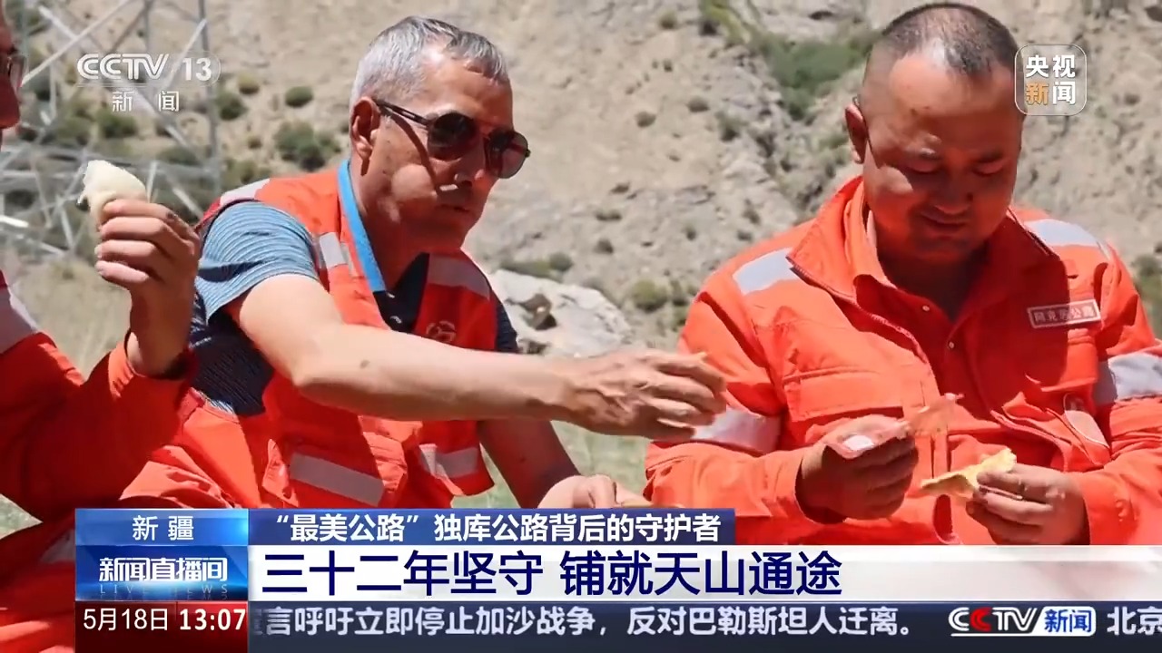 下午兩點(diǎn)多,亞克甫招呼大家停下來(lái)吃午飯。這幾天,亞克甫和同事們要搶在獨(dú)庫(kù)公路通車之前,把冰封了一個(gè)冬天的道路養(yǎng)護(hù)好。他們經(jīng)常沒(méi)時(shí)間回到養(yǎng)護(hù)站休整,午飯也只能在路邊對(duì)付一下。