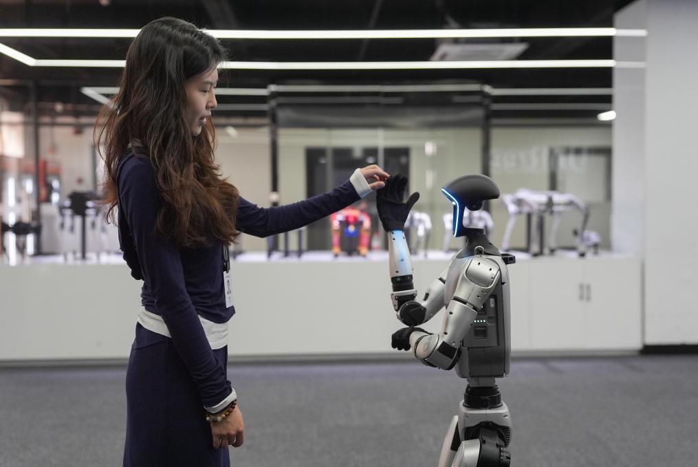 4月23日,在知名機器人公司杭州宇樹科技展廳內(nèi),宇樹人形機器人G1展示模仿動漫角色奧特曼的“光波”動作。 新華社記者 黃宗治 攝