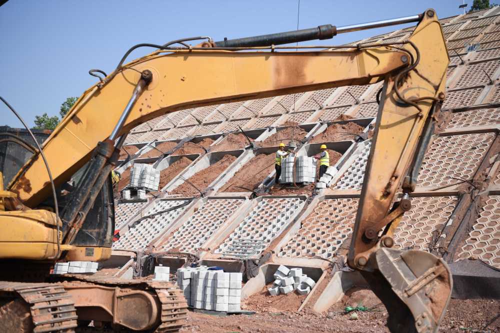 4月25日,中鐵十一局工人在合武高鐵安徽段金葉隧道口進行邊坡施工。新華社記者 劉軍喜 攝