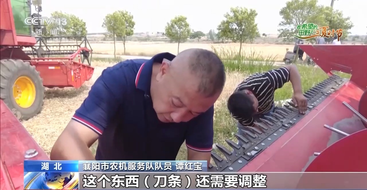 農(nóng)機(jī)維修也是夏收中非常重要的一個(gè)環(huán)節(jié)。在湖北省襄陽(yáng)市襄州區(qū)黃龍鎮(zhèn)潘明村的1000畝大田里,6臺(tái)收割機(jī)正趕在雨前搶收。突然,一臺(tái)收割機(jī)出現(xiàn)故障止步不前,機(jī)手撥打維修電話20分鐘后,農(nóng)機(jī)服務(wù)車(chē)趕到了麥田旁。經(jīng)過(guò)檢修發(fā)現(xiàn),這臺(tái)收割機(jī)刀條發(fā)生了斷裂。