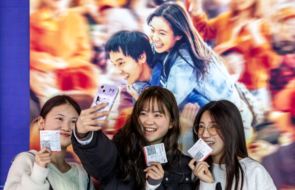觀眾手持電影票在貴州省黔西市橫店電影城電影海報前留影。新華社發(fā)(范暉 攝)