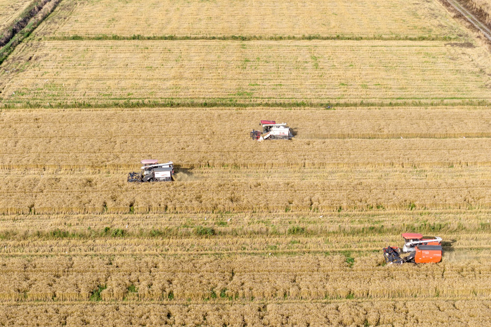 全國(guó)“三夏”大規(guī)模小麥機(jī)收全面展開。記者在河南、山東、浙江、江蘇等地看到,收割機(jī)開足馬力馳騁在麥田中,一排排小麥被整齊地切割、脫?!瓘V袤農(nóng)田一片繁忙景象。