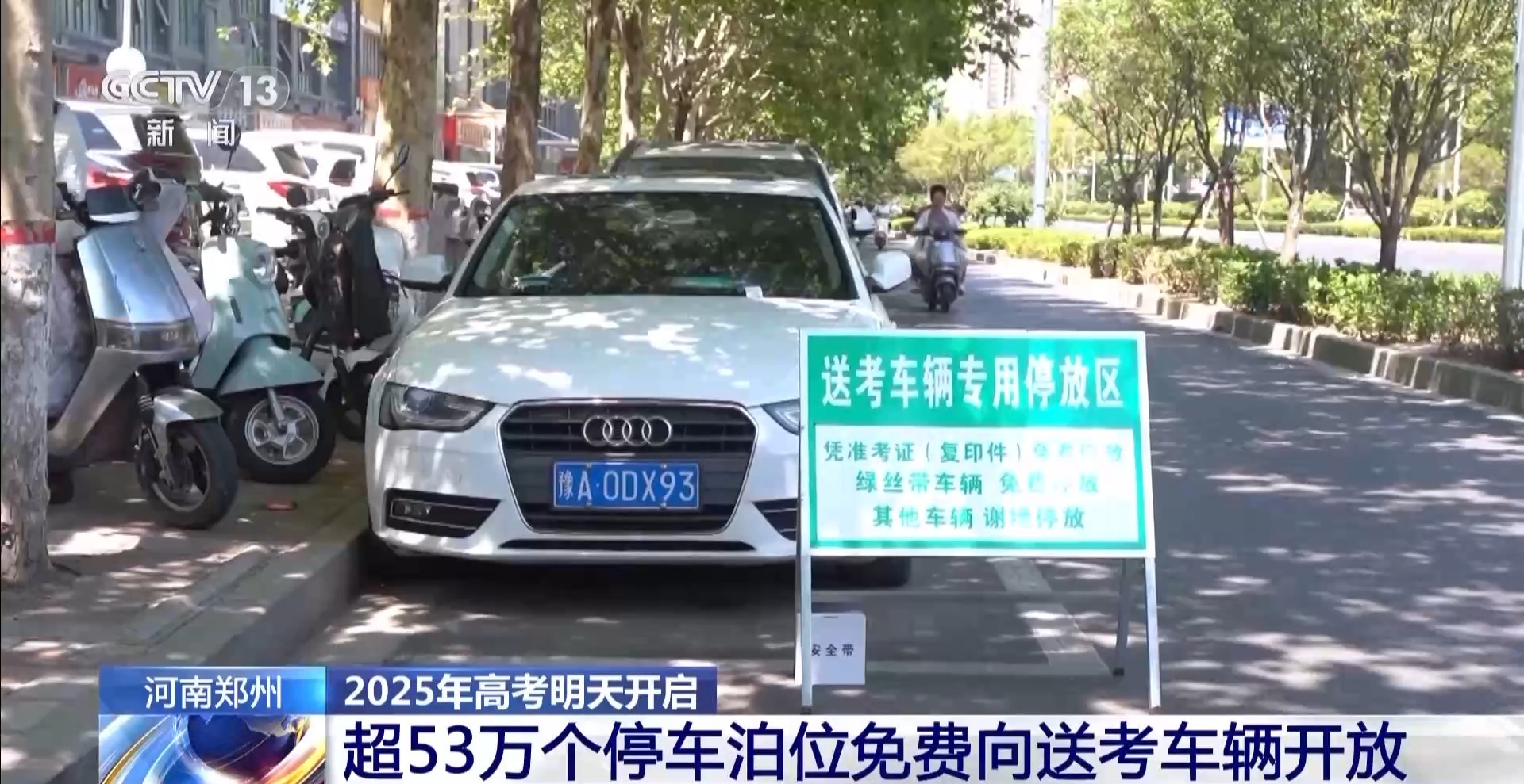 在河南鄭州,公交、城管等部門通過開展噪聲管控、開放免費(fèi)停車泊位。在鄭州市一個(gè)考點(diǎn)附近,周邊的道路停車泊位上,已經(jīng)設(shè)置了“送考車輛專用停放區(qū)”的引導(dǎo)牌。旁邊一個(gè)經(jīng)營(yíng)性停車場(chǎng),考試期間也向送考車輛免費(fèi)開放。據(jù)了解,今年高考期間,鄭州城管部門共設(shè)置各類高考停車泊位超53萬個(gè)。