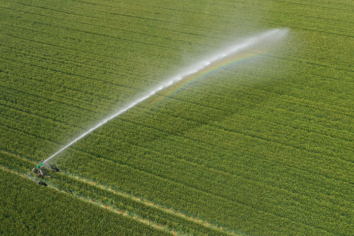 2025年5月7日,一臺(tái)自走式噴灌機(jī)在河南省焦作市溫縣黃莊鎮(zhèn)南韓村麥田間作業(yè)(無人機(jī)照片)。新華社發(fā)(徐宏星攝)