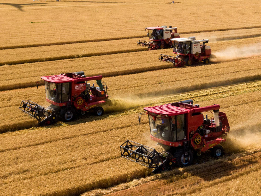6月5日,河南滑縣種糧大戶杜煥永組織農(nóng)業(yè)機(jī)械搶收小麥?;h縣委宣傳部供圖