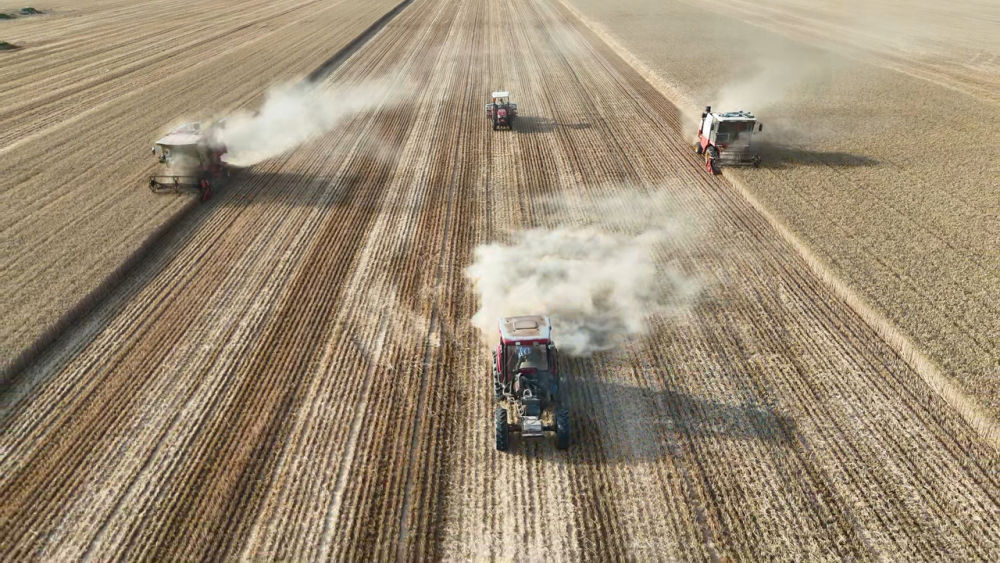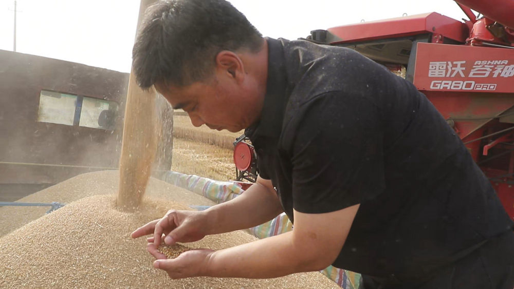 “平均我們這兩天每天能收獲小麥500噸左右?!标兾魇♂娇h種糧大戶楊曉飛說。