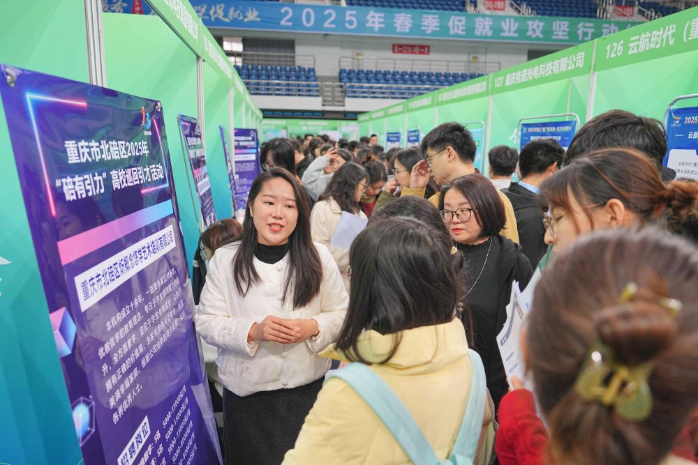 3月28日,西南大學應屆畢業(yè)生在2025年春季促就業(yè)攻堅行動綜合類雙選會現(xiàn)場了解崗位信息。新華社發(fā)(秦廷富攝)