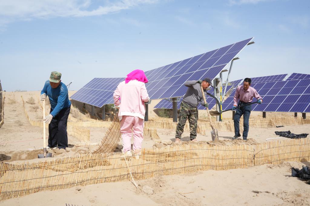 據(jù)介紹,該項(xiàng)目預(yù)計(jì)于6月底具備并網(wǎng)發(fā)電條件,投產(chǎn)運(yùn)行后年發(fā)電量達(dá)3.6億千瓦時(shí),配套治理沙地2.4萬(wàn)畝。新華林場(chǎng)場(chǎng)長(zhǎng)賀鑫說(shuō):“在開(kāi)展‘三北’工程攻堅(jiān)戰(zhàn)以來(lái),我們采取‘以工代賑’形式,組織周邊村民參與光伏項(xiàng)目建設(shè)、林草種植等全流程作業(yè),參與農(nóng)民的人數(shù)超過(guò)2000人。”