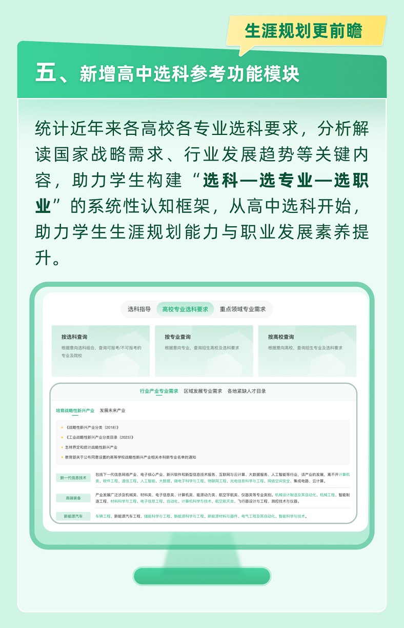 統(tǒng)計近年來各高校各專業(yè)選科要求,分析解讀國家戰(zhàn)略需求、行業(yè)發(fā)展趨勢等關(guān)鍵內(nèi)容,助力學(xué)生構(gòu)建“選科—選專業(yè)—選職業(yè)”的系統(tǒng)性認(rèn)知框架,從高中選科開始,助力學(xué)生生涯規(guī)劃能力與職業(yè)發(fā)展素養(yǎng)提升。