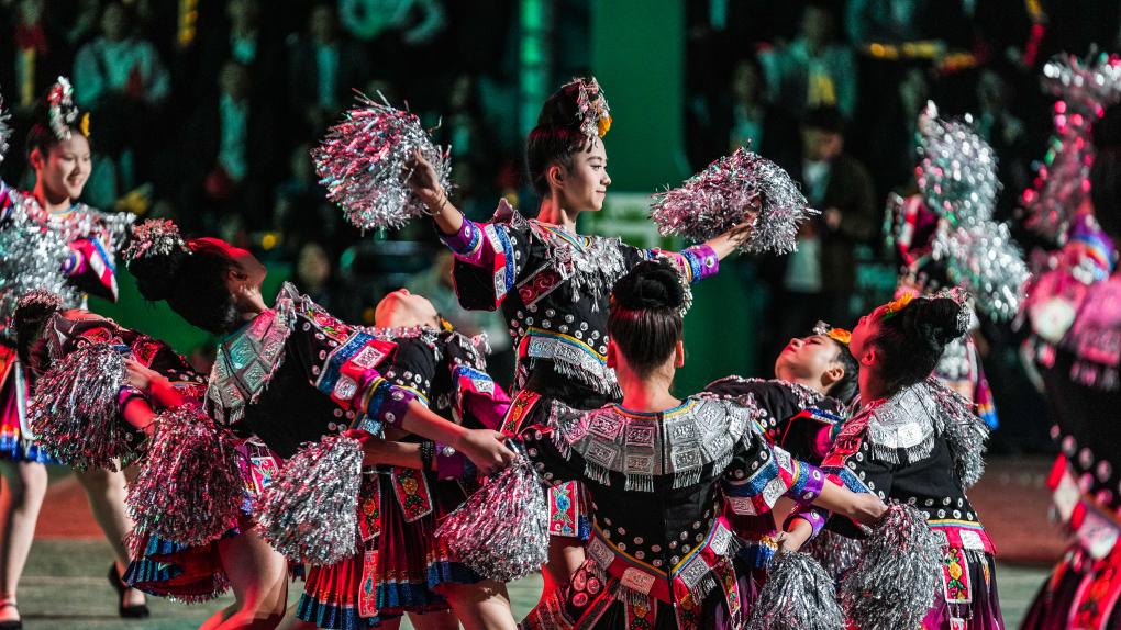 演員在大地流彩·2025年全國(guó)和美鄉(xiāng)村籃球大賽(村BA)啟動(dòng)儀式上進(jìn)行歌舞表演。新華社記者 陶亮 攝