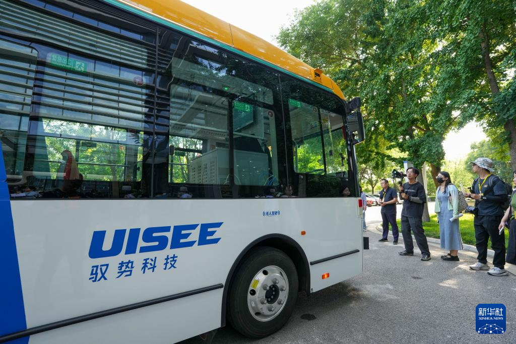 參觀者在北京馭勢科技參觀一款無人駕駛巴士(6月16日攝)。新華社記者 鞠煥宗 攝