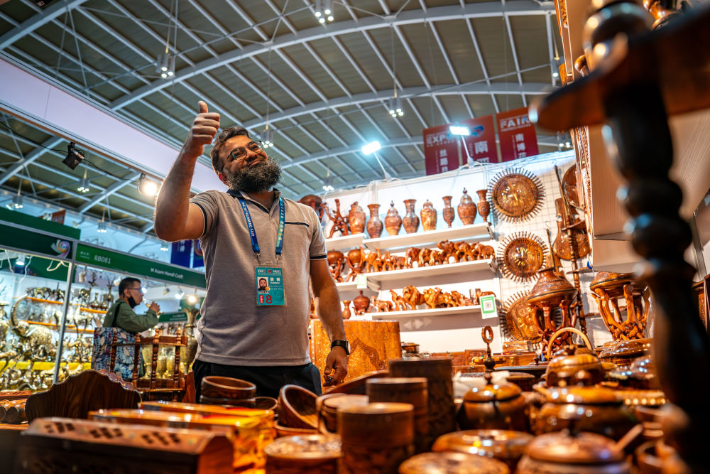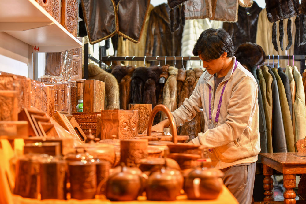 6月20日,顧客在南亞館巴基斯坦展區(qū)選購(gòu)銅制工藝品。