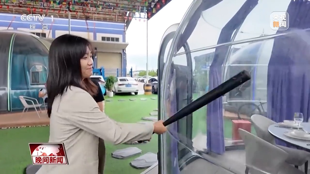 “星空房”的墻面材質(zhì)只有4毫米厚。為了驗(yàn)證房屋強(qiáng)度,企業(yè)負(fù)責(zé)人請(qǐng)記者現(xiàn)場(chǎng)用鐵棒猛擊外墻。幾輪擊打過后,墻面毫發(fā)無傷,沒有出現(xiàn)任何裂痕。