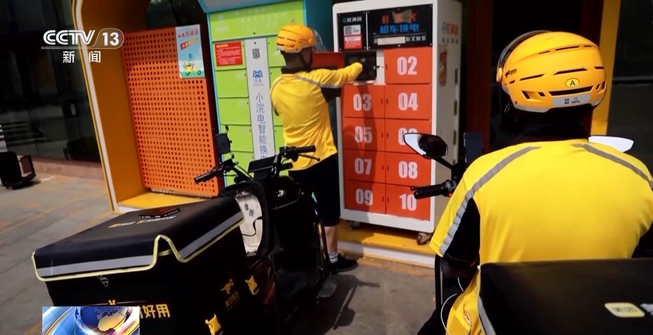 外賣員 崔鳳洋:給我們提供了很方便的換電站,我們?nèi)绻叻迤跊]有電了,可以來這里換電,如果中午非常熱,感到身體有點難受可以到這來,也提供解暑藥品。