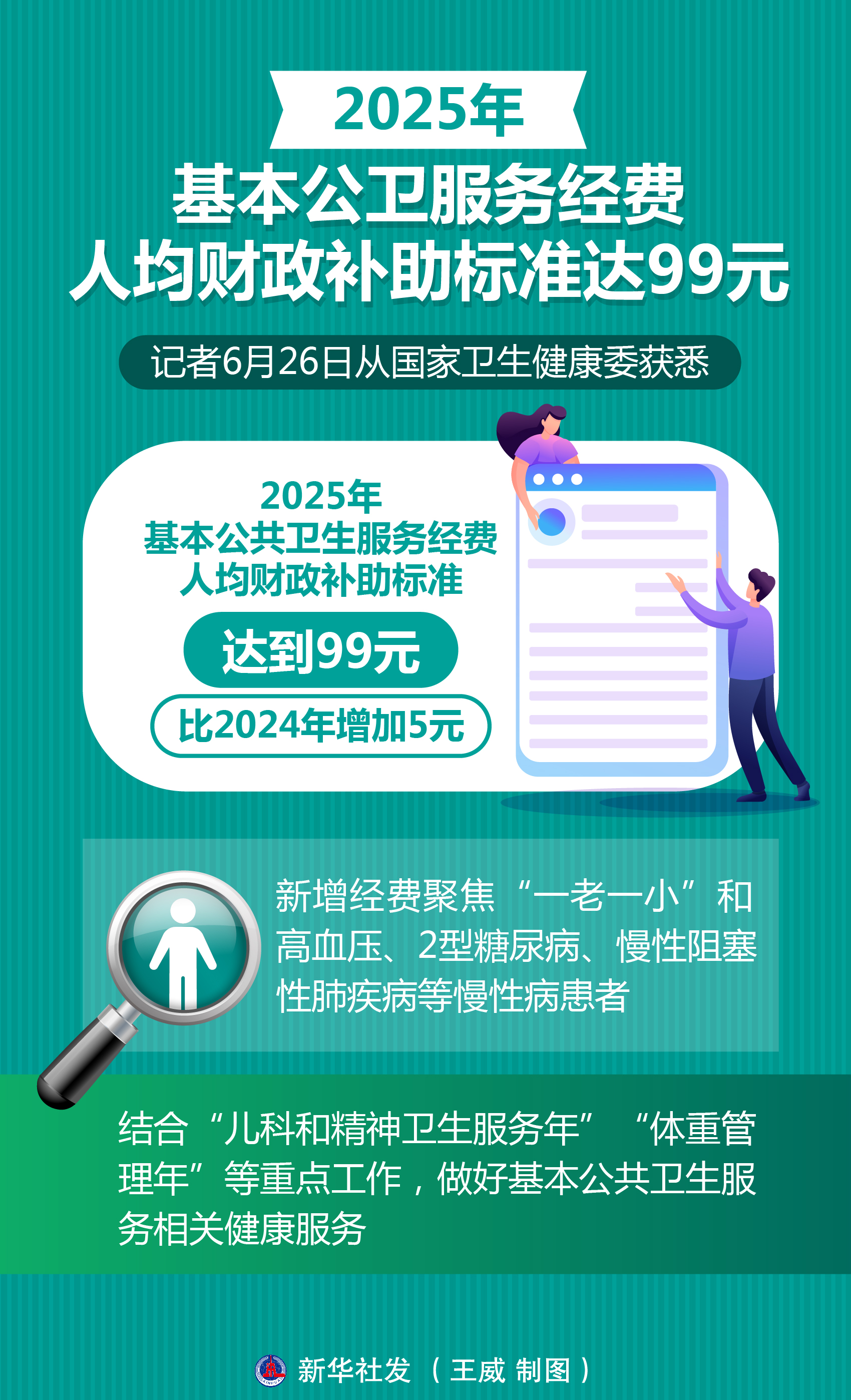 記者26日從國家衛(wèi)生健康委獲悉,2025年基本公共衛(wèi)生服務(wù)經(jīng)費人均財政補助標(biāo)準(zhǔn)達到99元,比上年增加5元。