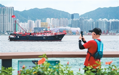 七月一日,由香港各界慶典委員會組織的二十八艘漁船在香港維多利亞港海面巡游。
