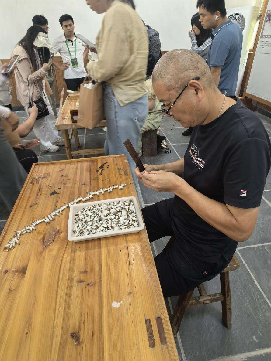 在博物館的體驗(yàn)區(qū)域,幾位制筆匠人正現(xiàn)場(chǎng)演示毛筆制作的各工藝環(huán)節(jié)。市級(jí)非物質(zhì)文化遺產(chǎn)項(xiàng)目代表性傳承人周平正咬著線的一端,兩手飛快地纏綁筆頭,這是制筆過(guò)程的“綁筆”環(huán)節(jié)。周平的徒弟李啟富在一旁認(rèn)真觀看,將師父的每一個(gè)動(dòng)作記在心里。