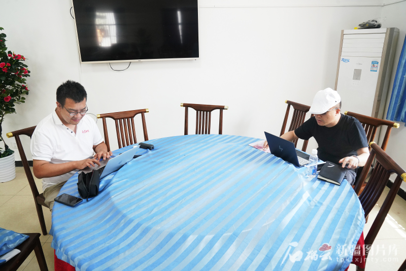 7月1日,在喀什公路事業(yè)發(fā)展中心疏附養(yǎng)護所蓋孜養(yǎng)護站,記者馬晉軒(左)和王永飛利用午餐時間準(zhǔn)備稿件。