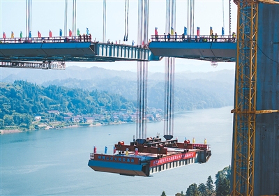 8月3日,由湖南路橋建設(shè)集團(tuán)承建的張官高速控制性工程洞庭溪沅水特大橋主橋順利合龍,為2026年全線通車奠定堅實(shí)基礎(chǔ)。張官高速公路北起張家界市永定區(qū),南至懷化市沅陵縣官莊鎮(zhèn),是國家高速公路網(wǎng)呼和浩特—北海高速公路的重要組成部分。圖為大橋施工現(xiàn)場,一塊鋼混結(jié)合梁在被緩緩提升。新華社記者 陳思汗攝