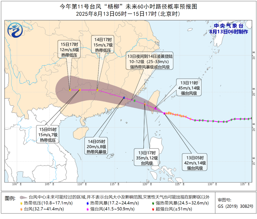 預(yù)計(jì),“楊柳”將以每小時(shí)25-30公里的速度向西偏北方向移動(dòng),強(qiáng)度還將有所加強(qiáng),即將于13日中午前后在臺(tái)灣東南部沿海登陸(臺(tái)風(fēng)級(jí)或強(qiáng)臺(tái)風(fēng)級(jí),40~45米/秒,13~14級(jí));穿過(guò)臺(tái)灣島后13日下午進(jìn)入臺(tái)灣海峽,并將于13日夜間至14日凌晨在福建廈門到廣東汕頭一帶沿海再次登陸(強(qiáng)熱帶風(fēng)暴級(jí)或臺(tái)風(fēng)級(jí),25~33米/秒,10~12級(jí));以后繼續(xù)向西偏北方向移動(dòng),強(qiáng)度逐漸減弱。