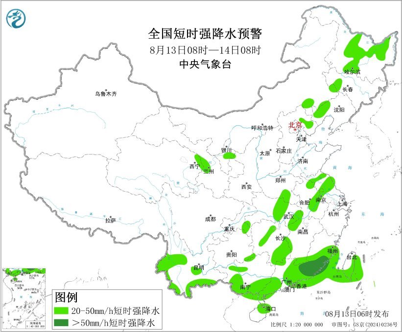 預(yù)計(jì),8月13日08時(shí)至14日08時(shí),黑龍江中部、吉林西部、遼寧西部、河南南部、湖北中部、江蘇北部、云南西部、廣東東部、福建東部和南部、西藏南部、臺(tái)灣島大部等地部分地區(qū)有大到暴雨,其中,福建東南部、廣東東南部、臺(tái)灣島東部和南部等地部分地區(qū)有大暴雨,臺(tái)灣島東部和南部等地局地特大暴雨(250~390毫米)。上述部分地區(qū)伴有短時(shí)強(qiáng)降水(最大小時(shí)降雨量20~50毫米,局地可超過(guò)70毫米),局地有雷暴大風(fēng)等強(qiáng)對(duì)流天氣。
