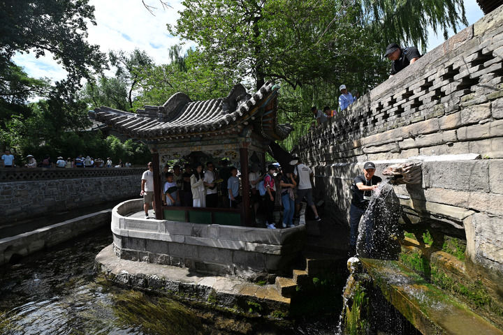 2025年8月7日,一名游客在晉祠難老泉感受泉水的清冽。新華社記者 詹彥 攝