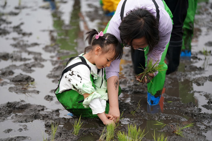 2024年5月4日,在太原市晉源區(qū)晉祠鎮(zhèn)北大寺村的稻田里,小朋友和家長在體驗插秧。新華社記者 詹彥 攝