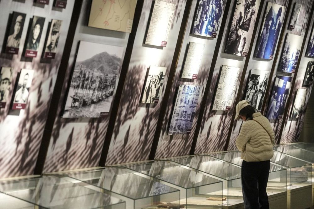 參觀者在遼沈戰(zhàn)役紀(jì)念館內(nèi)參觀(4月1日攝)。遼沈戰(zhàn)役紀(jì)念館收藏了穆青同志采寫的《東北抗日聯(lián)軍斗爭史略》。新華社記者潘昱龍攝
