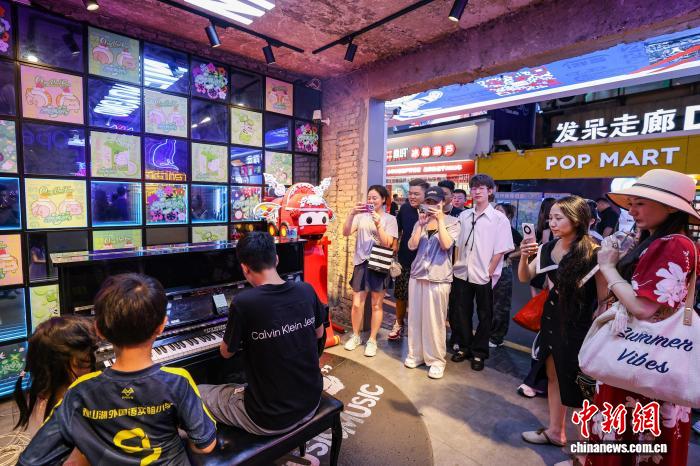 8月7日,游客在貴陽(yáng)市青云市集彈共享鋼琴被圍觀。中新社記者 瞿宏倫 攝