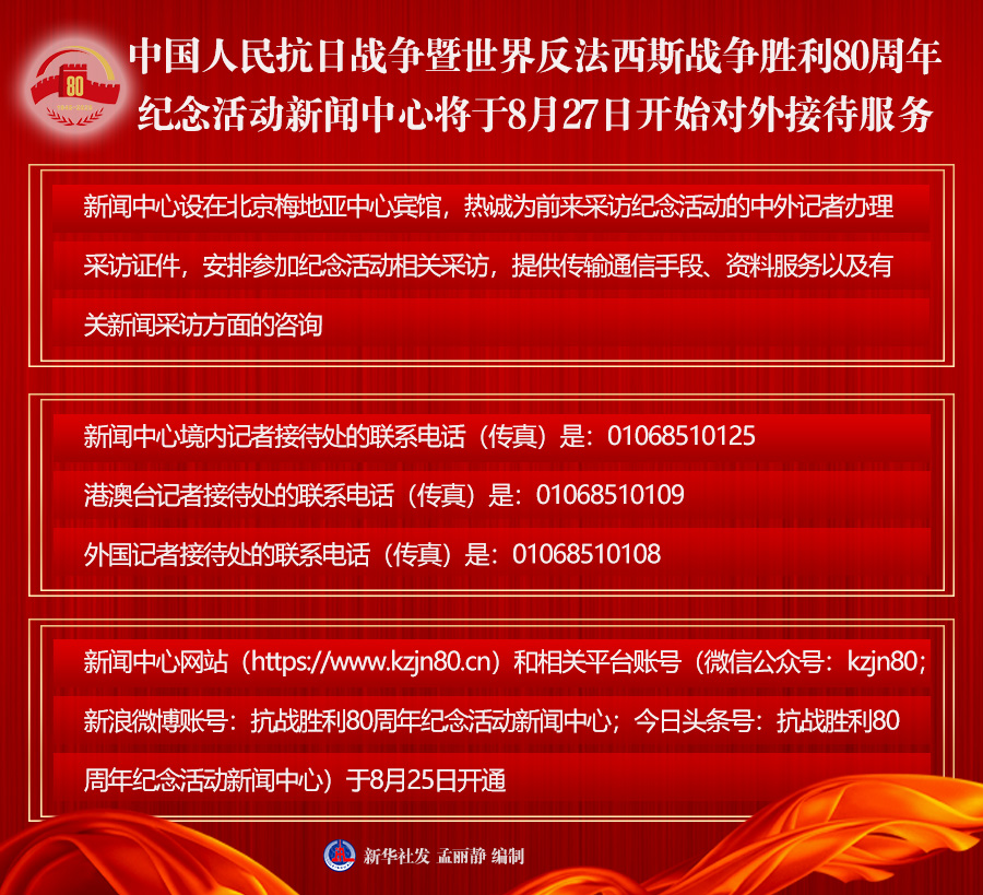 新聞中心網(wǎng)站(https://www.kzjn80.cn)和相關平臺賬號(微信公眾號:kzjn80;新浪微博賬號:抗戰(zhàn)勝利80周年紀念活動新聞中心;今日頭條號:抗戰(zhàn)勝利80周年紀念活動新聞中心)將于8月25日開通。