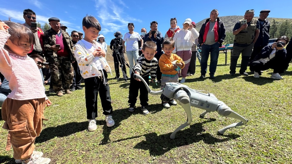 科普大篷車開(kāi)進(jìn)新疆阿勒泰青河縣套查干湖夏牧場(chǎng),當(dāng)?shù)匦∨笥押蜋C(jī)器狗互動(dòng)。(新疆科技館供圖)