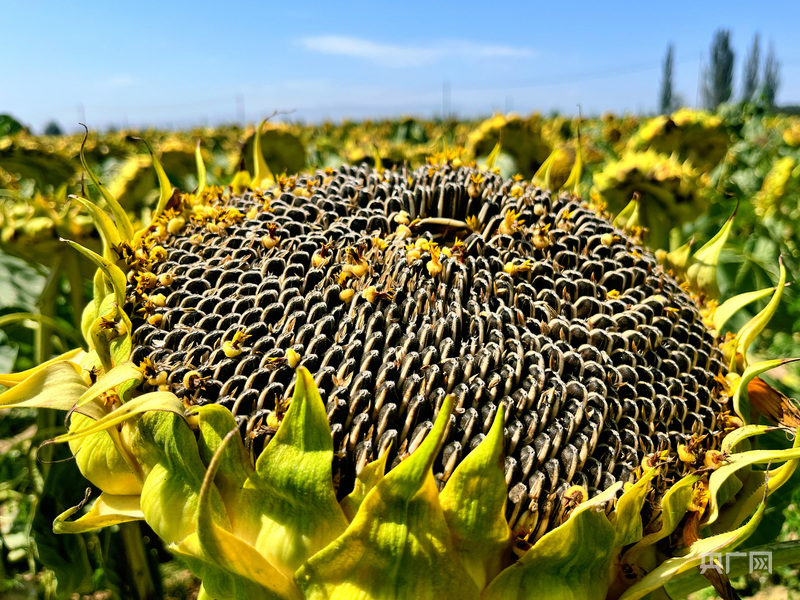 初秋時節(jié),內(nèi)蒙古阿拉善盟阿拉善左旗溫都爾勒圖鎮(zhèn)巴潤霍德嘎查的1.3萬畝葵花迎來豐收。田間地頭,農(nóng)戶們正忙碌地收割、插盤、晾曬,一片喜人景象。沉甸甸的葵花盤壓彎枝頭,顆粒飽滿、色澤金黃,不僅映襯出豐收的喜悅,更照亮了當(dāng)?shù)厝罕娫鍪罩赂坏摹敖鹕贰薄?/p>
