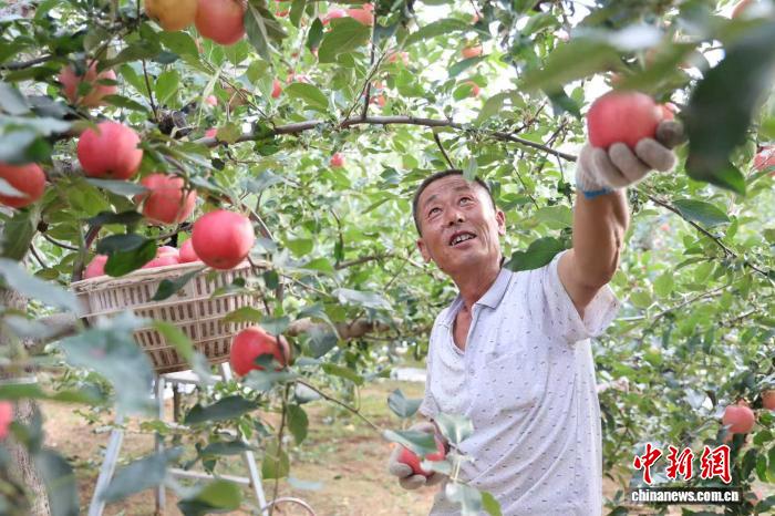 圖為陜西省延安市洛川縣的果農(nóng)正在采摘早熟蘋(píng)果?!±钸M(jìn) 攝