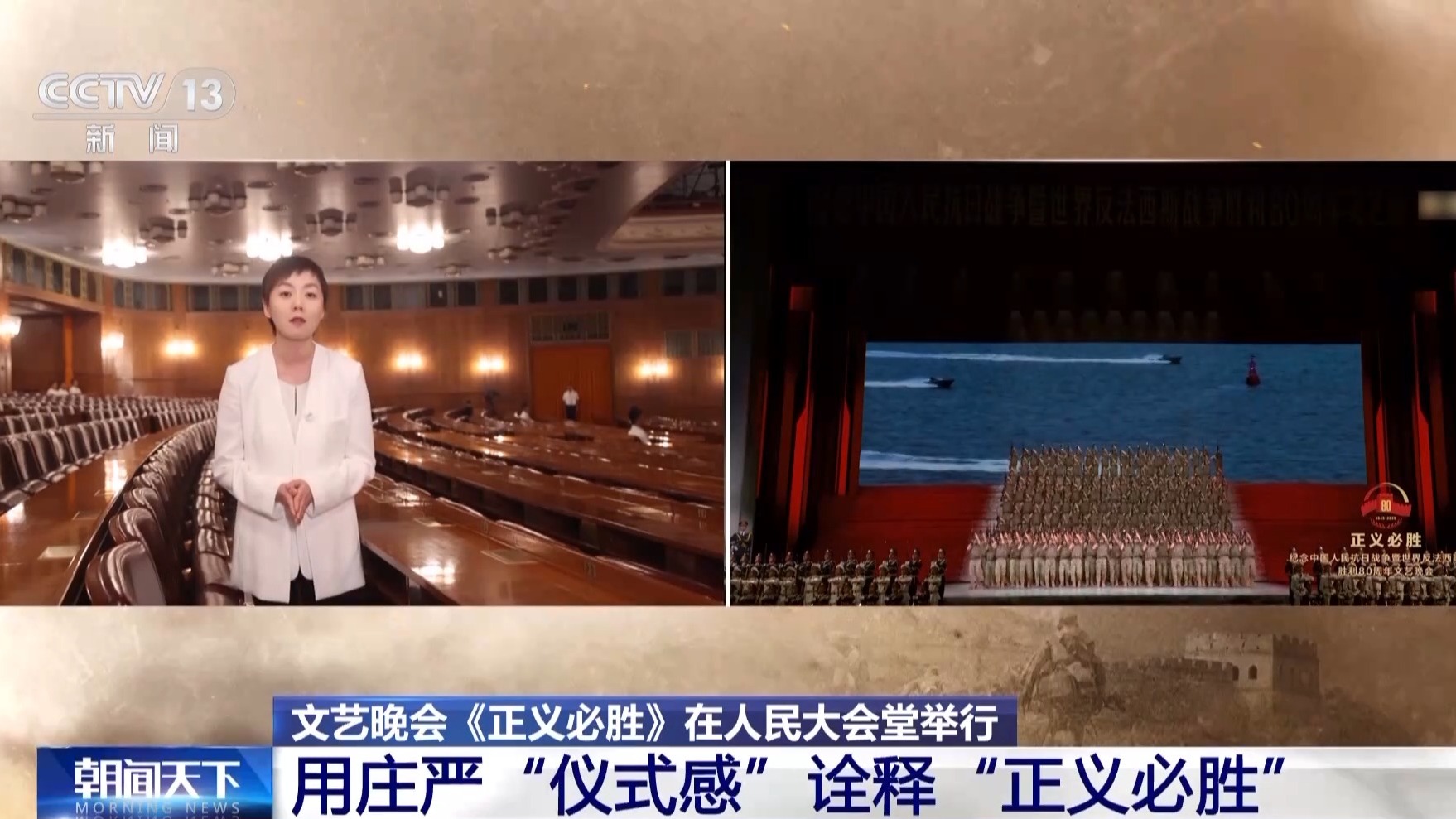3日晚,紀(jì)念中國人民抗日戰(zhàn)爭暨世界反法西斯戰(zhàn)爭勝利80周年文藝晚會《正義必勝》在人民大會堂舉行。