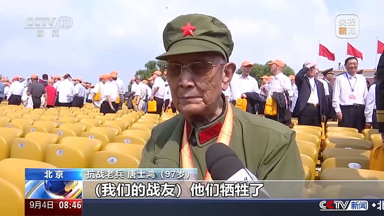 抗戰(zhàn)老兵 唐士鴻:我們的戰(zhàn)友他們犧牲了,沒有看到今天的勝利。現(xiàn)在中國人民解放軍能夠戰(zhàn)勝一切的敵人,叫戰(zhàn)友在地下安息。前一代人故去了,下一代或者多代要把接力棒接下來繼續(xù)戰(zhàn)斗。不要戰(zhàn)爭,不要打仗,要過和平的生活。
