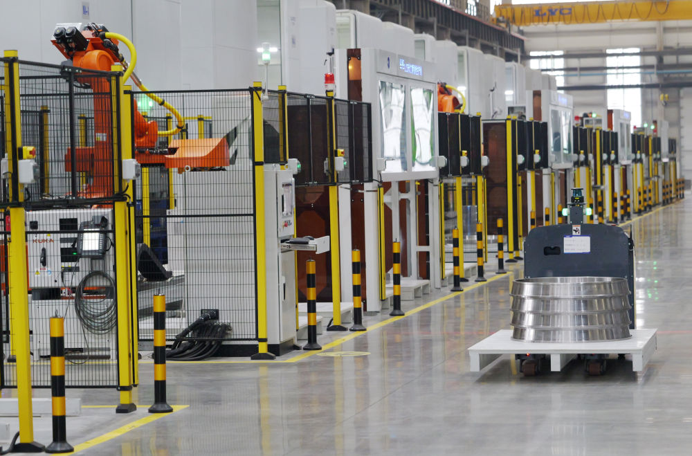 5月22日,自動導(dǎo)引車在洛軸集團(tuán)智能工廠生產(chǎn)線上作業(yè)。新華社記者 李嘉南 攝