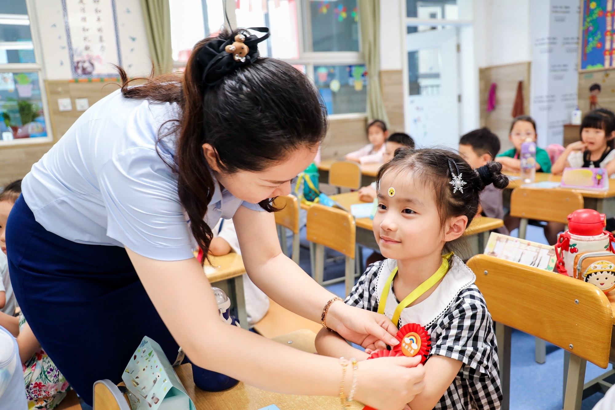 老師為新生帶上獎勵的“小勛章”(央廣網發(fā) 西安高新第八小學供圖)
