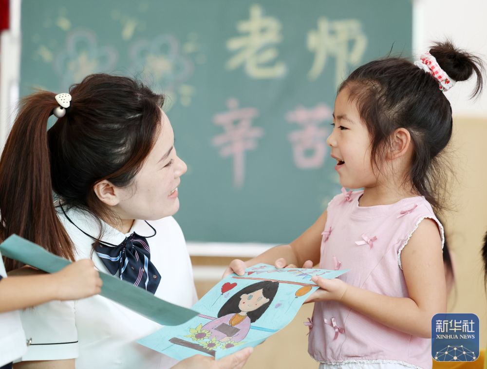 9月9日,山東省臨沂市郯城縣郯城街道官塘幼兒園的孩子將在老師的指導(dǎo)幫助下制作的繪畫(huà)送給老師。新華社發(fā)(張春雷攝)