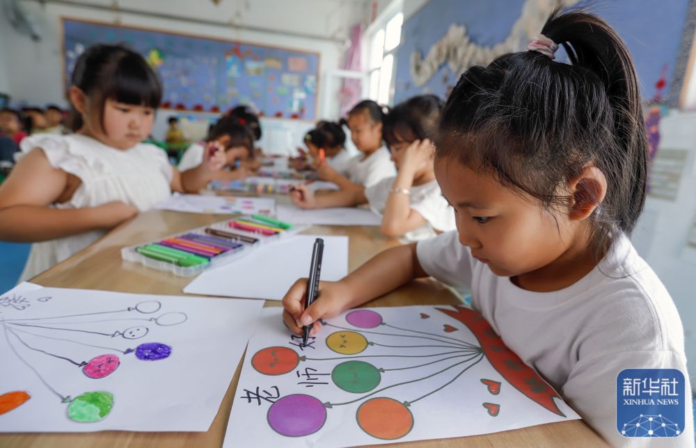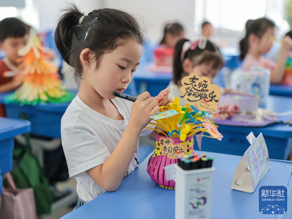 9月9日,河北省遵化市遵化鎮(zhèn)南關(guān)幼兒園的小朋友在繪制美術(shù)作品感念師恩。新華社發(fā)(劉滿倉(cāng)攝)
