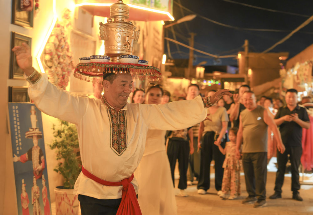 夜幕降臨,煙火氣息在庫(kù)車?yán)铣菑浡V場(chǎng)上傳來(lái)歡快的樂曲聲,舞者頭頂銅盤銅壺,腳步輕快,將迎賓之禮——薩瑪瓦爾舞展現(xiàn)在游客面前,掌聲與歡笑聲此起彼伏。