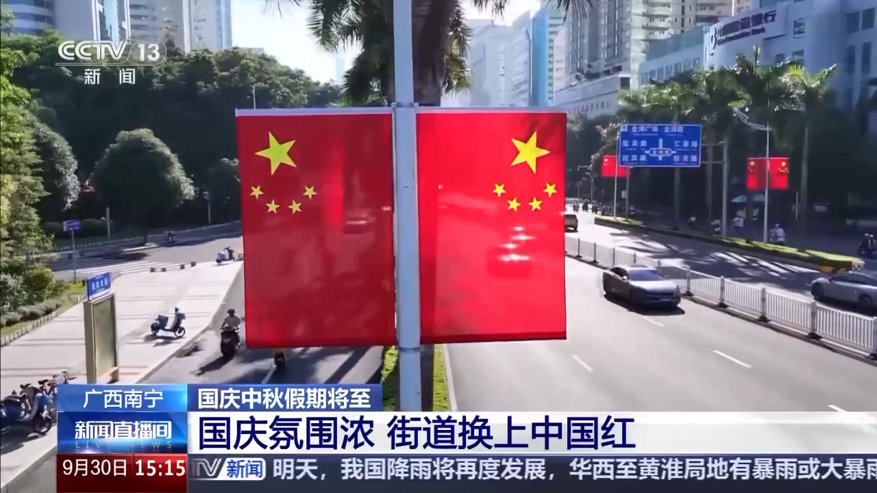 國(guó)慶節(jié)臨近,廣西、江蘇等地在城市道路、景區(qū)等區(qū)域掛上了國(guó)旗,營(yíng)造出祥和的國(guó)慶氛圍。